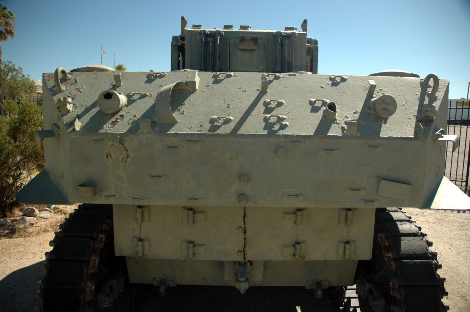 Rear overview of the Chiriaco Summit M5A1 showing the various brackets and tie down cleats for the pioneer tools.
