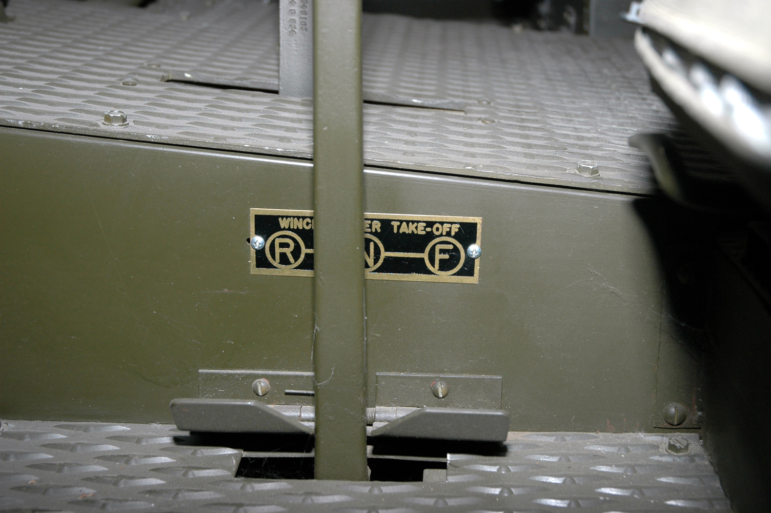 A close up of the base of the power take-off shift lever and it's instruction plate.